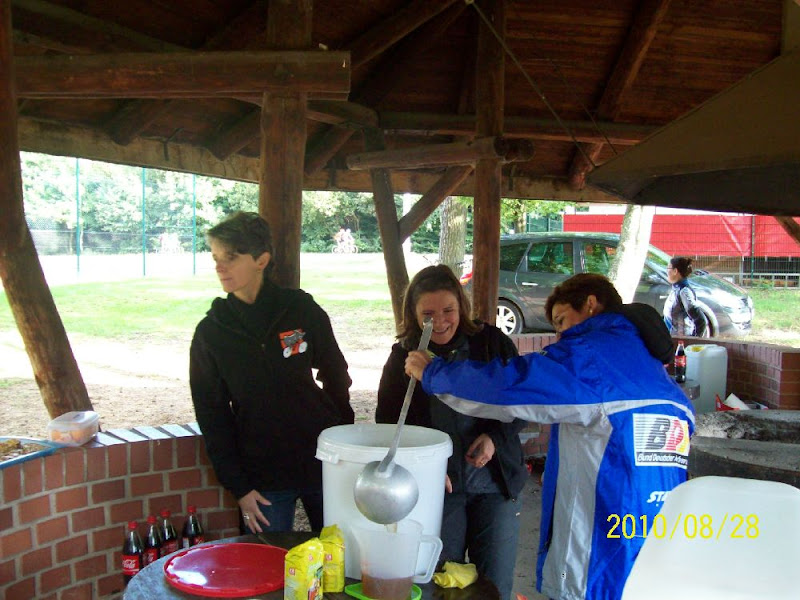 Geduldig warten die Helfer an der letzten Verpflegungen auf die wenigen Marathonfahrer die zu dieser Zeit noch auf der Strecke sind. Wenige Meter vor dem Ziel werden wir dann noch etwas früher geduscht als gewollt.