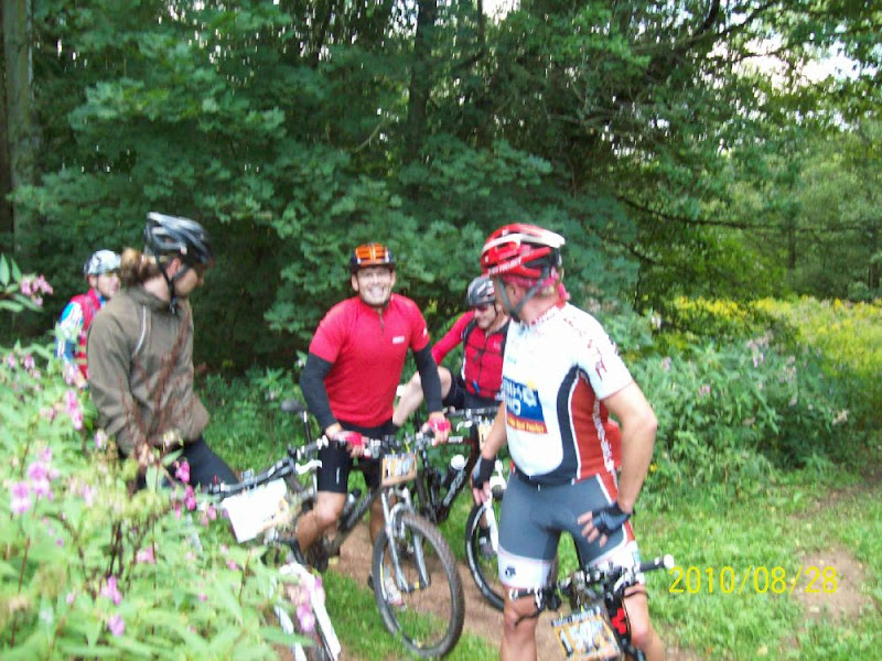 Nach der ersten Runde herrscht im Startbereich bereits buntes Treiben. Die Parkplätze rund um die Halle sind dicht. Nach ausgedehnter Obstpause geht es auf die zweite Runde. Wir sind zwar nur noch zu zweit aber Tom hat seinen Humor noch nicht verloren. Und so vergehen die weiteren 60km fast wie im Flug. Kurz vor Schluß wird die Strecke dann doch nochmal wegen Wildsaugefahr geändert und uns werden nochmal satte 150hm zusätzlich vor die Reifen gelegt.