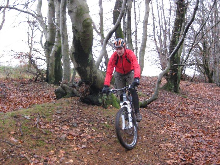 Der aufgeweichte Boden und die glitschigen, von dichtem Laub verdeckten Wurzeln erfodern Gefühl und feine Technik wenn man sturzfrei unterwegs sein möchte. Das gelang an diesem Morgen so gut, daß wir an Sylvester gleich noch eine Tour am Oberlimberg / Teufelsburg dranhängen wollen. Näheres dazu siehe Forum.
