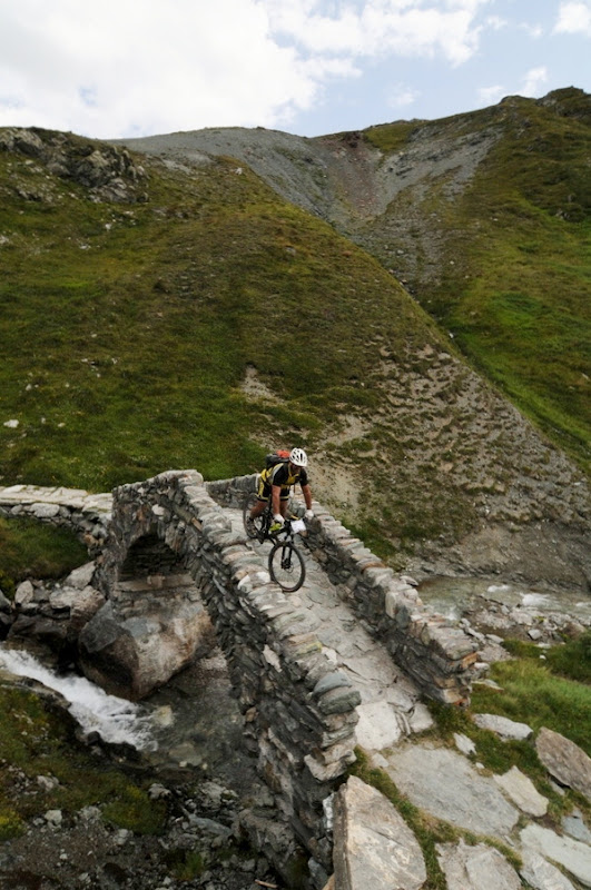 Die Etappe war zwar immerhin etwa 72 km lang, sie weißt aber nur "1560" Höhen- Meter auf. Kurz nach dem Start in Livigno folgten wir für ein paar Kilometer dem großen Stausee. Dann ging es auf einem ziemlich knackigen Aufstieg hinauf zum Alpiselle-Pass. Die Abfahrt hinunter zum Punkt Passi-di Fraele war bereits ein erster Höhepunkt. Ein langer, wunderbarer Singletrail wartete schon auf uns.