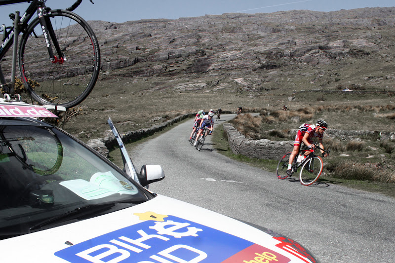 Flüge Buchen, Material mit der Fähre über England nach Dublin schiffen, Betreuer organisieren... BIKE AID steht für BIKE AID, für einen Verein, kein Name eines Hauptsponsors, keine professionellen Strukturen sondern Motivation Dinge zu bewegen aus Idealismus und Begeisterung für den Radsport. Für uns bedeutet die Teilnahme an einer solchen Rundfahrt einen riesengroßen Kraftakt. Und vor Ort prallen Welten aufeinander. Die Profis bestimmen vorne die Rennen und sorgten auf den ersten Etappen für Durchschnittsgeschwindigkeiten um die 48Km/h. Dahinter versuchten die regionalen Teams aus Irland im Grupetto die Zeitrückstände gering zu halten. Und irgendwo dazwischen gehörten wir hin. Für hinten zu schnell, für vorne zu langsam. Bis zur fünften Etappe waren wir aber alle noch gut im Rennen. Doch vom ein auf den anderen Tag blieben noch 2 BIKE AID Fahrer übrig. Matthias bekam Fieber, Philipp eine Erkältung und Timo stürzte schwer.