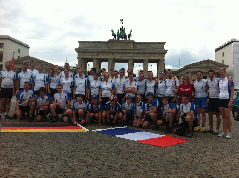 Mit ortskundiger Führung geht es Richtung Berlin. Dank der Begleitung kommen wir in den Genuss durch den Schlosspark von Sanssouci in Potsdam zu radeln. Diese erlaubten Schleichwege muss man schon kennen, um sie zu finden. Es geht weiter über die berühmte Glienicker Brücke und dann passieren wir das lang ersehnte Ortsschild von Berlin. Vom ersten Ortsschild bis zur Stadtmitte sind es nur noch 35 km durch die Stadt. Und dann ist es so weit: mit wehender französischer und deutscher Flagge passieren wir das Brandenburger Tor, fahren über den Pariser Platz und werden von einer deutsch-französischen Delegation unter anderem mit der saarländischen Sportministerin Frau Bachmann vor der französischen Botschaft empfangen. Das Gefühl ist unbeschreiblich und die eine oder andere Träne wird vor Glück und Erleichterung vergossen.