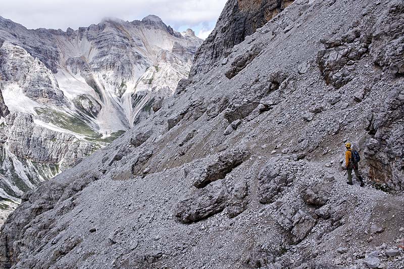 Ich setze den Rundweg um den Berg fort – wunderschöne Ausblicke mildern meine schweren Gedanken über die Aufgabe ab. Ich wäre gerne auf dem Gipfel gewesen, genau wie auf dem Paternkofel. Aber auch mit einer Klettersteigsicherung ist ein Absturz immer mit hohem Verletzungsrisiko verbunden. Die Klettersteigsicherung hilft nur das nackte Leben zu retten – der Absturz am Drahtseil kann über mehrere Meter freien Fall führen, bis die nächste Stahlsicherung im Fels des Drahtseils erreicht ist. Bis dorthin schrammt man am Fels entlang mit den entsprechenden Blessuren an den Extremitäten – dann kommt der absolute Stopp!. Den mildert das Klettersteigset mit einer textilen Bandbremse, die einen aprupten Stopp des Falls verhindert. Ach ja – die Bandbremse funktioniert nur einmal. Danach handelt es sich um eine einfache Seilsicherung mit zwei Karabinern.