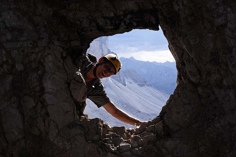 Heute werden diese Stollen durch die Dolomiten, dort wo es passt, in Klettersteige integriert. Also Lampe an und Helm auf, den ohne diesen hätte es einige schmerzhafte Kopfnüsse und Löcher in der Birne gegeben. Wer mehr auf den Weg unter seinen Füssen achtet, vergisst manchmal auch nach oben zu schauen. Teilweise sind die Stollen so eng und niedrig, dass wir wie Käfer auf allen Vieren durch die Stollen krabbeln mussten.