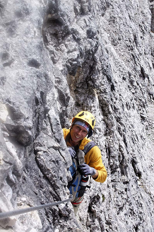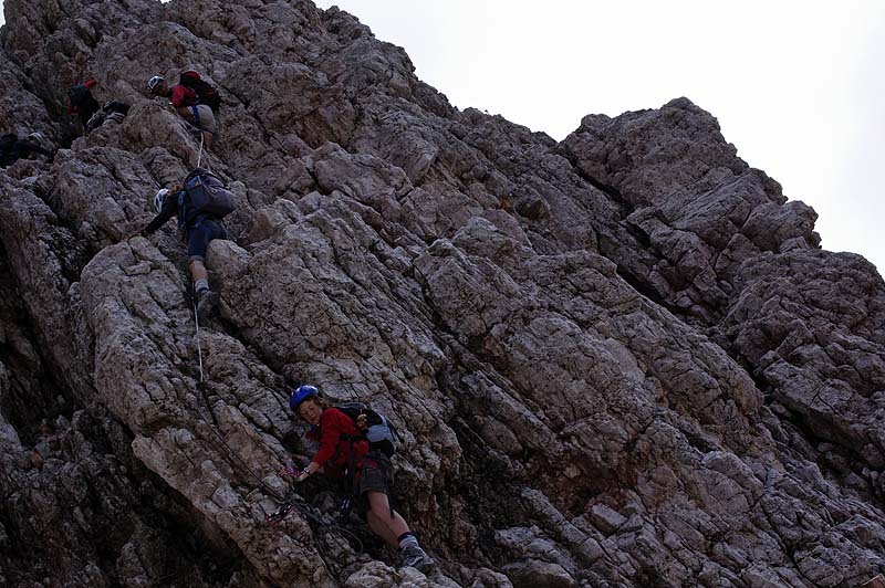 Das ist schon ein Unterschied gegenüber den beiden vorherigen Klettersteigen. Aber es macht Spass! Gott sei Dank habe ich keine Höhenangst. Ich kann an der glatten Wand im sicheren Stand auch schöne Bilder schießen. Die Kamera habe ich gut am Geschirr des Rucksacks festgemacht und mit schnellem Griff bereit. Nach fünf Stunden Dauerkletterei steil hinauf Richtung Gipfel erreichen wir den Abzweig zum Gipfel.