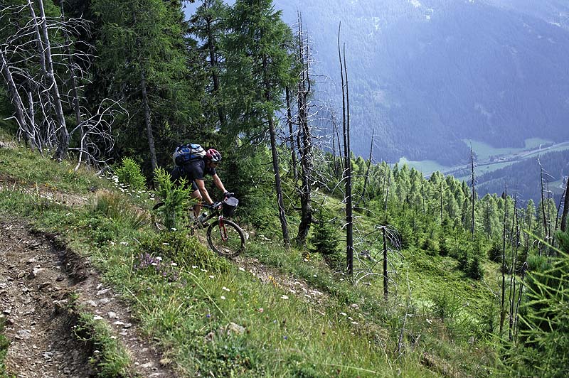 Oben an der Sillianerhütte gönne ich mir ein alkoholfreies Weizen als isotonischer Durstlöcher. Jetzt folgt der Höhepunkt des Stonemantrails – die sogenannte Demut-Passage. Dieser Trail fordert die volle Aufmerksamkeit und jedes Prozent technisches Fahrkönnen, das wir aufbieten können. Das wir sturzfrei bis auf einen kleinen Porutscher meiner Wenigkeit runterkommen, ist fast ein Wunder. An einigen wenigen Stellen verweigert mein Bike die Gefolgschaft und bremst einfach, die alte Mähre. Ich bin gnädig und trage das Bike über die Abrisskante des Trails statt es ins Tal zu werfen und nehme die Verweigerung nicht weiter übel.