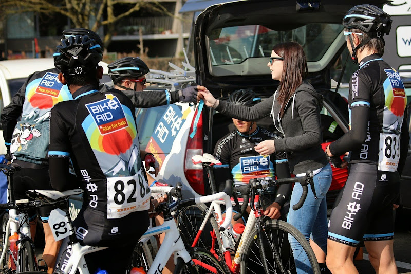 Aber viel mehr gibt es über Meron zu erzählen. Dass er jetzt bei uns in Deutschland angekommen ist und zumindest erst mal ein Visum für drei Monate bekommen hat ist für uns schon ein großer Erfolg. Die Angelegenheit war alles andere als einfach. In welche diplomatischen Verquickungen wir uns damit begeben haben, hätten wir uns zuvor nicht ausmalen können. Frisch aus Eritrea befand er sich kurzerhand später am Start in Holland. Sportlich ist Meron sicherlich ein nicht wenig talentierter Fahrer. Aber es ist verständlich, dass er sich hier erst mal zu Recht finden muss. So konnte er dem Rennen irgendwann nicht mehr folgen und wir gingen davon aus, dass er im Besenwagen Platz genommen hätte. Im Ziel kam dann ein überbelegter Besenwagen an, aber ohne Meron. Wir warteten und warteten und warteten, machten uns Sorgen. Plötzlich klingelt unser Handy. Meron war dran, er stand irgendwo an einem Bahnhof. Wir wussten aber eines ganz sicher: Meron hatte kein Handy dabei und wusste definitiv von keinem von uns die Handynummer auswendig. Gut, ab ins Auto und an beschriebenen Bahnhof gefahren, dort aber kein Meron. Gegenüber war ein Kebab Imbiss, dort war Meron freudigst im Gespräch und bestens versorgt. Als er orientierungslos hinter dem Rennen umher irrte sprach er einfach jemand an. Naja, wie soll es anders sein: Es war ein Eritreer, er hatte einen Kebab Imbiss und die beiden freuten sich über diesen Zufall. Aus dem Kebab Laden telefonierte Meron nach Eritrea zu jemand, der jemanden kannte, der jemanden Kannte der Timos Telefonnummer hatte…. Mittlerweile haben wir Meron ein deutsches Handy organisiert; er telefoniert nun täglich mit einem Kebab Imbiss in Holland, so was gibt es nur im echten Leben. Nebenbei: BIKE AID Fahrerin und Betreuerin Désirée Schuler konnte aus bislang ungeklärten Umständen an den belgischen Polizei Meisterschaften im Staffel Hindernislauf teilnehmen und diese erfolgreich abschließen. Aber das ist eine andere Geschichte.