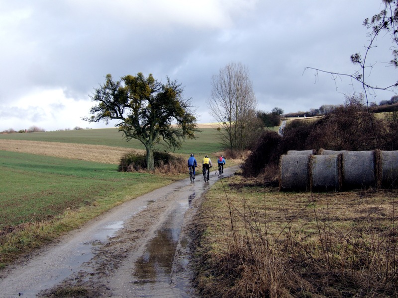 Hochwasser an der Nied den Weg versperrt und uns zu einen kleinen Umweg durch die schlammigen Wiesen zwingt. Manche kommen aber auch mit ausgefeilter Technik mitten durchs Hochwasser ;-)