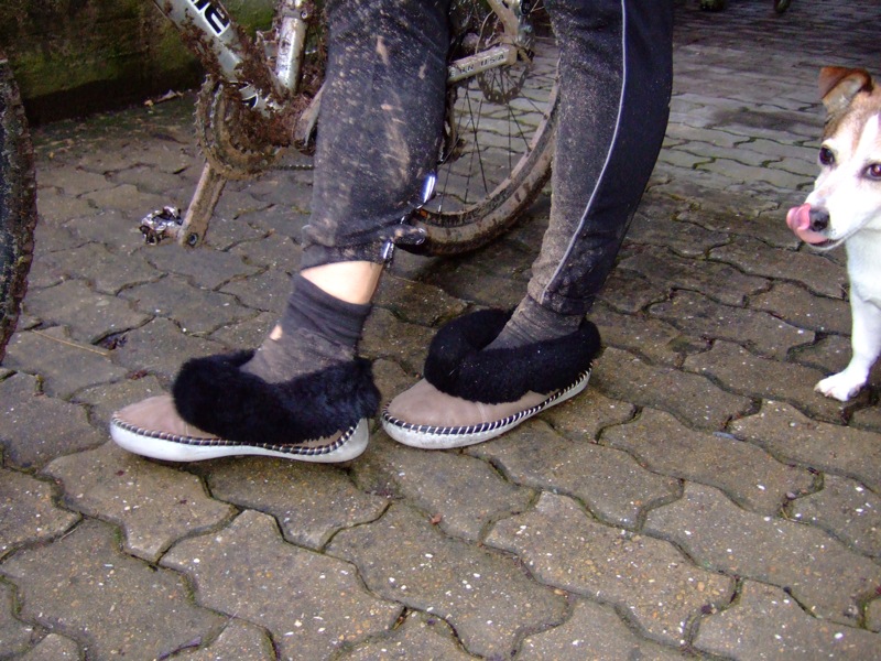 SchlappenKaum zu Hause kann es Pille nicht mehr erwarten und zieht sich gleich draußen schon mal die bequemen Schlappen an (Bild unten). Die trägt er jetzt bis nächsten Samstag - dann gehts mit den Bike-Schuhen wieder in den Wald.....