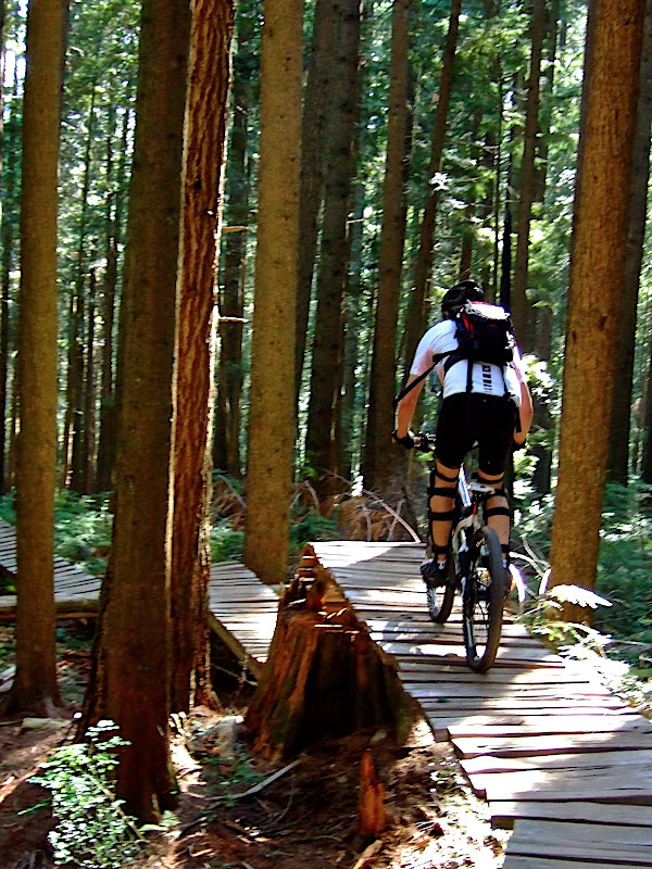 Eine Ecke weiter sagt Shannon: Look, over there we have a nice Titter-Tatter! Ich: Hä? What the hell is a Titter-Tatter? Da sehe ich das Teil auch schon. Eine äußerst schmale Wippe, die zur Überbrückung einer Geländeunebenheit gebaut wurde. Man fährt mit schwung drauf - und das Ding kippt dann am Scheitelpunkt mitsamt dem Biker nach unten. Nicht gerade ungefährlich aber mit etwas Schwung ganz gut zu machen. Als sich gerade Stolz über meine Titter-Tatter-Erstbefahrung breit machen will knattert es hinter mit und eine Dame im reiferen Alter brettert über den Holztrail an mir vorbei. Ich traue meinen Augen nicht: ein 29"er Singlespeeder ohne Federung. Es sieht so als als ob ich auf der Hausfrauen-Hardtail-Strecke gelandet bin.