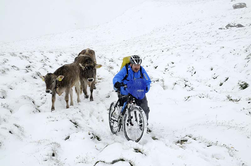 Draußen ist es knapp unter Null Grad und irgendwie gar nicht gemütlich. Die Wegezeichen sind durch den Schnee auch nur schlecht erkennbar, aber irgendwie kommen wir doch langsam voran. Nach einiger Zeit bewegen wir uns in einer immer steiler werdenden Hanglage, die langsam gefährlich wird, denn Schnee ist bekanntlich kein stabiler Faktor. Dennis und ich diskutieren - ich bin fürs Durchsteigen - er will lieber zurück und nichts riskieren. Ich gebe nach und es stellt sich heraus, dass Dennis recht hatte - wir waren vom rechten Weg abgekommen. Biken ist fast nicht möglich, da wir kaum die Hindernisse erkennen können. Die Wettervorhersage hatte auch recht - bis beinahe 1800 Meter liegt eine bis 20 bis 40 cm dicke pappige Schneedecke. Danach geht der Schneefall in einen “beschissenen” Regen über, der uns den Rest des Tages richtig verleidet. Wir fahren nunmehr schon den dritten Tag fast nur in Regenklamotten - das nervt . Also Abbruch in Scuol - Suche nach einer ordentlichen Dusche mit Bett und einem guten Abendmahl - dann ist die Welt wieder in Ordnung.