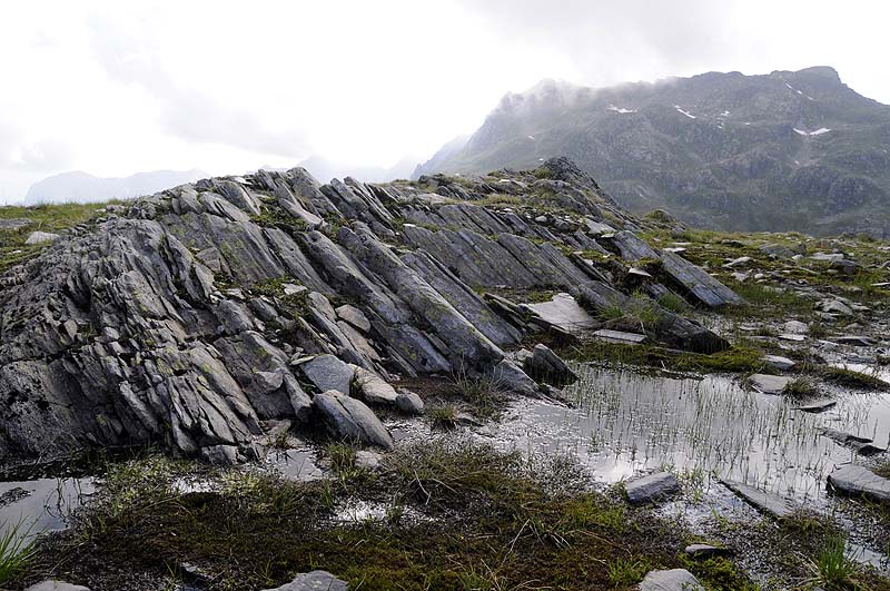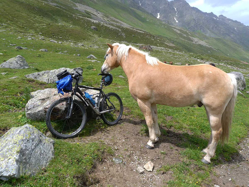 An diesem Morgen gießt Petrus gerade die Alpen genau über uns. Es regnet so Gott erbärmlich, das wir uns fühlen, als würden wir unter einer großen Schwallbrause fahren. Aber es nützt ja nichts - wir wollen heute wenigsten ein paar Kilometer vorankommen. In Ischgl kaufe ich mir noch ein paar wasserdichte Handschuhe im Sportgeschäft, weil es nun auch merklich kälter wird. Eine Kaltfront ist im Anmarsch und über Nacht soll Schnee fallen - bis auf ca. 1800 Meter - es ist eigentlich Mitte Juli und Hochsommer. Mit diesen Aussichten und nun etwas wärmeren Fingern gehen wir an den Aufstieg ins Fimbatal. Diese wunderschöne Strecke führt uns nun schon wieder aus Österreich heraus und auf Schweizer Gebiet. Dort bewacht ein Pferdeherde die Grenze und inspiziert genau unser Räder und unsere Rucksäcke. Es sind halt Schweizer! Eines der Viecher beißt sogar in meinen Sattel. Während wir Fotos machen, rücken sie einem ständig auf die Pelle. Offensichtlich wird diese Herde öfters von den Bergwanderen und vielleicht auch Mountainbikern mit Leckereien gefüttert, sodass die Tiere daraus einen Anspruch auf Wegezoll ableiten.