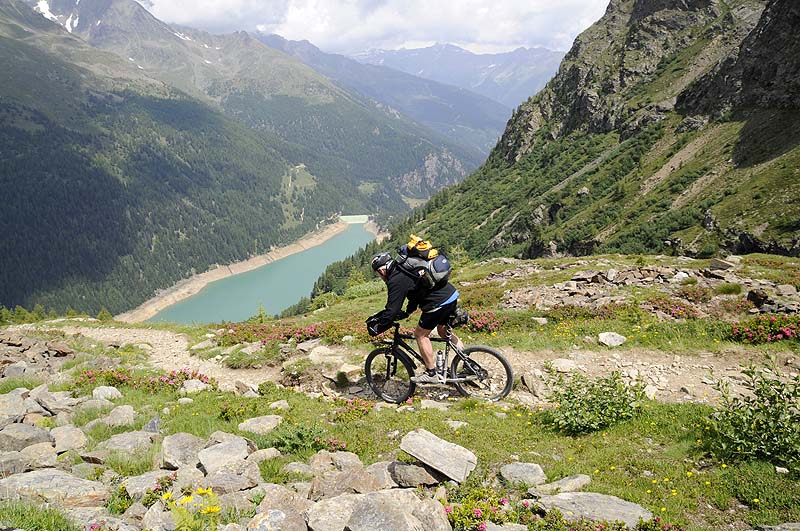 Unvorstellbar, dass wir vor zwei Tagen noch durch den Schnee gestakst sind. Es ist warm und sonnig. Auf einer alten Straße rollen wir Richtung Bormio zunächst noch auf Asphalt. Später geht es dann bergauf Richtung La Baita, einer Hochalm - jetzt wechselt es ins Hochprozentige auf Schotter mit groben Steinplatten. Wer hier durchgehend fährt, verdient höchsten Respekt - Dennis möchte den meinigen und strengt sich mächtig an - auch weil er nicht so effektiv das Rad bergauf schieben kann wie ich - bin eben ein guter Bergaufschieber. Teilweise fahrend und dann wieder schiebend bewältigen wir den Passo dell’ Alpe auf fast 2500 Meter. Kurz darauf treffen wir auf den Gaviapass, der immerhin deutlich über 2600 Meter geht und fahren diesen auf gutem Asphalt bis oben hin. Die Abfahrt ist rasend schnell und wir beneiden diejenigen nicht, die hier mit dem Rennrad rauf müssen. Der Gaviapass verdient seinen schlechten Ruf zurecht, denn die Rampen sind teilweise höllisch steil. Am Ziel in Precasaglio sind wir wieder auf nur 1400 m und kehren in der einzigen sehr gemütlichen Albergo ein, die der kleine Ort zu bieten hat.