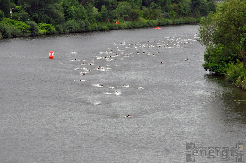 300 Neoprenanzüge mit weißen Badekappen stürzten sich in die 17,5°C kalte Saar und brachten das Wasser zum Schäumen. Auf den 1,5km hatte man sämtliche Körperteile der Mitschwimmer an allen unmöglichen und möglichen Stellen des eigenen Körpers, so dass zeitweise an Schwimmen nicht zu denken war. Dennoch meisterten wir alle die vorgegebene Strecke und durften endlich in unserer Schokoladendisziplin ran: Radfahren.