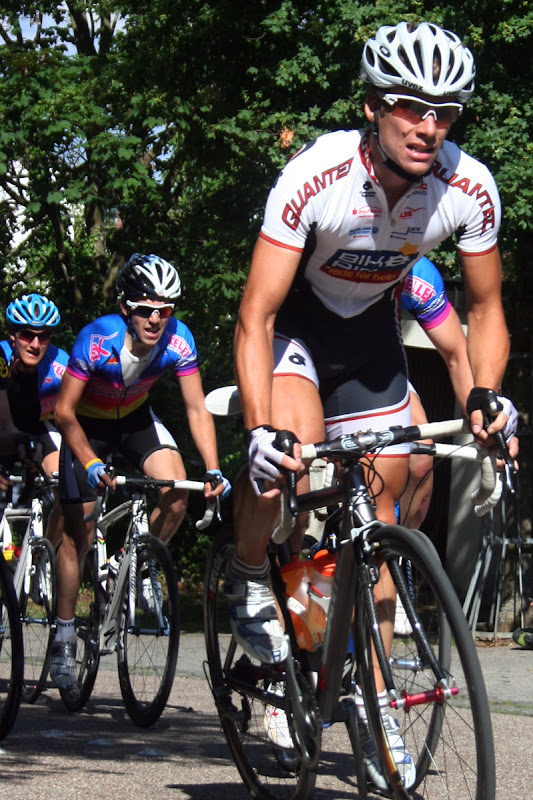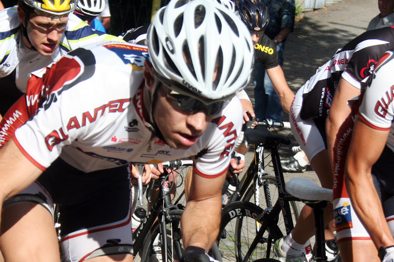 Die Option mit dem Antritt hatte auch Matthias Schnapka. Mit 3 Fahrern waren wir das kleinste Team am Start. Jan Paffhausen stürzte auf der ersten Etappe schwer und konnte das Rennen nicht mehr fortsetzen. Nur noch zu zweit waren die Aussichten nicht groß. Auf der zweiten Etappe gelang Matthias Schnapka aber die Flucht in einer Vierergruppe und Anschließend der zweite Platz. Die 4 Fahrer hatten sich einen Vorsprung von 1:30min rausgefahren und damit gute Aussichten in der Gesamtwertung. Doch um dies zu halten, musste Nils Kramer und Matthias Schnapka in den weiteren Etappen einiges an Kraft investieren. Auf der 3. Etappe entwischte eine Gruppe mit 5 Fahrern und hatte zwischenzeitlich 1:45min Vorsprung. Rund 30 Runden mussten Nils und Matthias im Feld die Verfolgungsarbeit leisten um am Ende den Vorsprung auf 22. Sekunden zu reduzieren.
